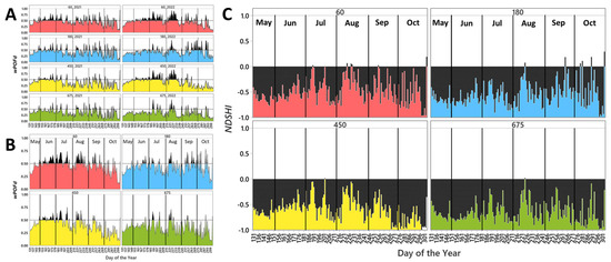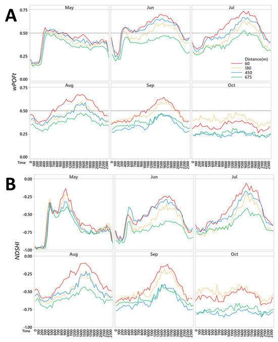 By October, NDSHI displayed the least variation across hourly intervals compared to previous months (Figure 6B), consistent with the patterns observed in wPOFt (Figure 7A). Nevertheless, a moderate increase in MHF between 0600 and 1900 was still evident at sampled distances closer to the road, while sample sites farthest from the road maintained notably lower NDSHI values throughout the day, comparable to values only displayed in the late evenings and early mornings of June–August (Figure 7B). A spatial distinction was clearly evident between similar NDSHI values and patterns at 60 and 180 m that were greater than similar NDSHI values and patterns at 450 and 675 m (Figure 7B).