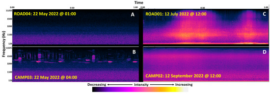 Spectrograms of (A) low-frequency geophonic ambience and “silent acoustic niches” at mid-high frequencies in the early morning of May at 675 m from Exit Glacier Road within Kenai Fjords National Park, Alaska, (B) mid-high frequency biophonies of the dawn chorus and low frequency geophonic ambience at 450 m from the road in spring, (C) full-spectrum technophony from tourist vehicles at 60 m from the road during peak tourist season, and (D) full-spectrum geophony from wind at 180 m from the road in September.