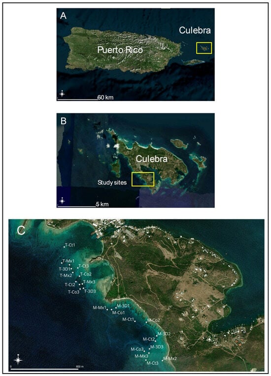 This study was conducted on the southwestern coast of the island municipality of Culebra, Puerto Rico (Figure 1). It is located approximately 27 km off eastern Puerto Rico, in the northeastern Caribbean Sea, and spans approximately 11 × 7 km. Experimental plots were located within two general locations exposed to similar environmental conditions, depth distribution, exposure to surface currents, and occasional runoff and pollution pulses: Punta Tampico (TAM), which included Bahía Sardinas, Punta Tampico, and Playa Dátiles (centroid: 18.297882° N, −65.302582° W), and Punta de Maguey (MAG), including Punta de Maguey, Playa Cascajo, and Cayo Ahogado (centroid; 18.292634° N, −65.297451° W). Both regions are dominated by a mixture of patch reefs and colonized pavements separated by a mixture of sand, rubble, and seagrass bottoms. The maximum diameter of each of the two locations was roughly 1 km. Experimental study sites were separated somewhere between 200 and 300 m from each other.