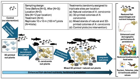 This study aimed to understand the before-and-after impacts of a coral restoration experiment on reef fish assemblages. Conducted on Culebra Island, Puerto Rico, it tested the null hypothesis that there would be no significant difference in the response of fish assemblages across four different coral out-planting intervention levels: natural A. cervicornis out-plants, 3D-printed A. cervicornis out-plants, mixed natural and 3D-printed out-plants, and controls (no intervention). This study provides timely information on the short-term (one year) impacts of hybrid coral restoration interventions.