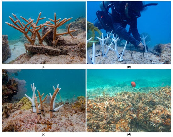 A total of 12 replicate sampling sites were randomly selected within representative coral reef habitats at each location (N = 24) (Figure 2). Experimental treatments were randomly assigned to triplicate sites per treatment as follows: (a) natural colonies of A. cervicornis; (b) 3D-printed colonies of A. cervicornis; (c) mixed stands of natural and 3D-printed colonies of A. cervicornis; and (d) control plots (no intervention) (Figure 3). Four replicate 10 × 10 m (100 m2) plots were established adjacent (10 m apart) to each other per site on each location. Out-planting was conducted at a density of one colony per m2 (100 colonies per 100 m2 plot). In the mixed out-planting treatment, 50% were natural and 50% 3D-printed colonies. The 3D-printed corals were made of polylactic acid (PLA) filaments and were 20 cm high, with a main branch and four additional branches, matching the average size of natural corals six months post-out-planting. PLA is known to degrade over time in marine environments influenced by factors such as temperature, salinity, and microbial activity [,]. Natural A. cervicornis colonies were raised in in situ coral nurseries adjacent to the out-planting sites. Out-planting was conducted using masonry nails and plastic ties. Natural out-plants ranged in size from ~15 to ~25 cm.