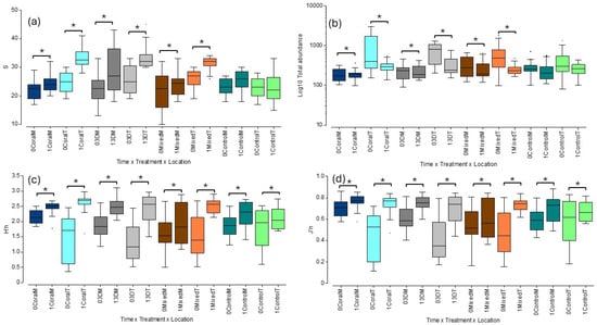 Box-plot diagram of BACI spatio-temporal variation in fish community parameters: (a) species richness; (b) total abundance; (c) species diversity index (H’n); (d) evenness (J’n). 0 = before; 1 = after. M = Maguey (darker tones); T = Tampico (lighter tones). Blue = coral; gray = 3D-printed; brown = mixed; green = control plots (no intervention). Asterisks illustrate significant temporal differences (p < 0.0500).