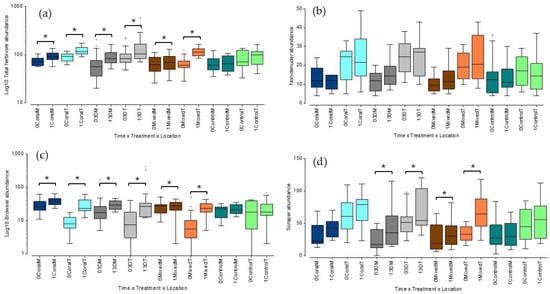 Box-plot diagram of BACI spatio-temporal variation in herbivore fish functional group abundance: (a) total herbivores; (b) non-denuders; (c) browsers; (d) scrapers. 0 = before; 1 = after. M = Maguey (darker tones); T = Tampico (lighter tones). Blue = coral; gray = 3D-printed; brown = mixed; green = control plots (no intervention). Asterisks illustrate significant temporal differences (p < 0.0500).