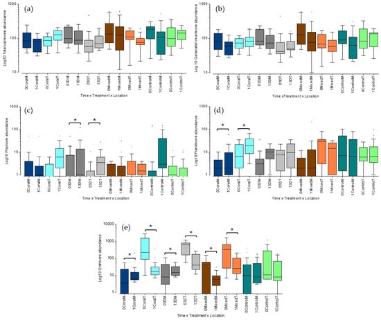 Box-plot diagram of spatio-temporal variation in carnivore fish functional groups abundance: (a) Total carnivores; (b) generalist invertivores; (c) piscivores; (d) planktivores; (e) omnivores. 0 = before; 1 = after. M = Maguey (darker tones); T = Tampico (lighter tones). Blue = coral; Gray = 3D-printed; brown = mixed; green = control plots (no intervention). Asterisks illustrate significant temporal differences (p < 0.0500).