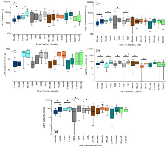 Box-plot diagram of spatio-temporal variation in herbivore fish functional groups biomass: (a) total biomass; (b) total herbivores; (c) non-denuders; (d) browsers; (e) scrapers. 0 = before; 1 = after. M = Maguey (darker tones); T = Tampico (lighter tones). Blue = coral; gray = 3D-printed; brown = mixed; green = control plots (no intervention). Asterisks illustrate significant temporal differences (p < 0.0500).