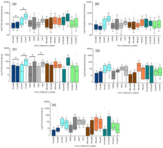 Box-plot diagram of spatio-temporal variation in carnivore fish functional groups biomass: (a) total carnivores; (b) generalist invertivores; (c) Log10 piscivores; (d) planktivores; (e) omnivores. 0 = before; 1 = after. M = Maguey (darker tones); T = Tampico (lighter tones). Blue = coral; gray = 3D-printed; brown = mixed; green = control plots (no intervention). Asterisks illustrate significant temporal differences (p < 0.0500).