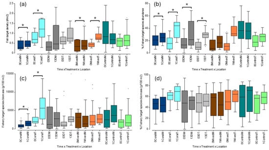 Box-plot diagram of spatio-temporal variation in fishery target species parameters: (a) Abundance; (b) percent abundance; (c) biomass; (d) percent biomass. 0 = before; 1 = after. M = Maguey (darker tones); T = Tampico (lighter tones). Blue = coral; gray = 3D-printed; brown = mixed; green = control plots (no intervention). Asterisks illustrate significant temporal differences (p < 0.0500).