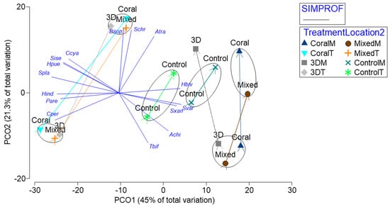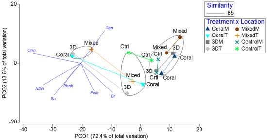 Fish community structure (based on fish functional group biomass) also showed a significant temporal change (p = 0.0003), but no significant treatment effects (Table 7). Observed variation in fish community structure by biomass was significantly different between locations (p < 0.0001). There were significant time × location (p = 0.0193) and treatment × location interaction effects (p = 0.0003). A significant change in fish community structure based on biomass data was documented within coral and 3D-printed treatment groups, but none for the mixed treatment or controls (Table S7).