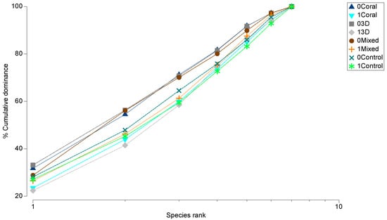 Spatio-temporal variation in fish community structure was quantified between 2022 and 2023 following a before-after-control-impact (BACI) design and a three-way permutational analysis of variance (PERMANOVA) [], with time (before, one year after), treatment (natural A. cervicornis, 3D-printed A. cewrvicornis, mixed out-plants, control plots), and location (TAM, MAG) as main variables, following 9999 permutations of √-transformed data and on Bray Curtis resemblance []. Data were first analyzed for fish community parameters: (a) species richness, (b) total abundance, (c) total biomass; (d) species diversity index (H’n), and (e) evenness (J’n). Spatio-temporal variation in trophic functional group abundance and biomass was tested as above for the following guilds: (a) total carnivores, (b) generalist invertivores, (c) piscivores, (d) planktivores, (e) omnivores; (f) total herbivores, (g) non-denuder herbivores, (h) browser herbivores, and (i) scraper herbivores. Spatio-temporal variation in trophic functional group biomass were also tested as above. Fish species trophic functional classification was based on historical databases obtained from Puerto Rico []. Fish community structure spatio-temporal dynamics were tested as above using trophic group √-transformed abundance and biomass data. Principal coordinates ordination (PCO) was used to project spatio-temporal variation in fish community trajectory based in √-transformed abundance data and on Bray–Curtis resemblance [] following 9999 permutations []. This allowed identifying which trophic groups explained observed patterns of variation. Also, variation in abundance data from experimental plots was projected using a dominance curve []. Abundance–biomass comparison (ABC) plots based on trophic functional group abundance and biomass were used to test for disturbance effects [].