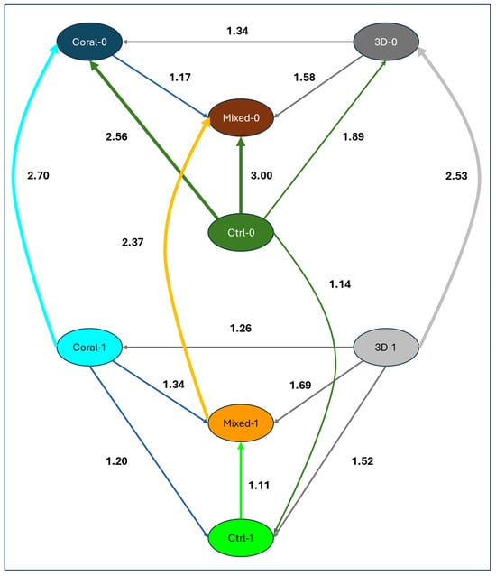 There is a growing development of 3D-printed artificial reef units for various objectives []. Coral restoration has been shown to enhance fish assemblages by increasing coral density, colony size, and benthic spatial heterogeneity, which provide shelter and feeding grounds to numerous species []. Over time, feedback mechanisms following coral restoration promote enhanced coral growth due to the formation of nutrient hotspots created by fish aggregation in restored areas [,]. Based on this principle, the field experiment conducted in this study aimed to test the role of 3D-printed Staghorn coral, Acropora cervicornis (Lamarck, 1816), intermingled with natural A. cervicornis out-planted colonies to temporarily enhance fish attraction. This approach promotes faster nutrient hotspot formation to accelerate coral growth from the beginning of coral out-planting. Integrating 3D-printed corals with natural corals offers a novel synergistic approach that leverages the strengths of both artificial and natural elements, enhancing coral demographic performance by rapidly improving fish–coral interactions.