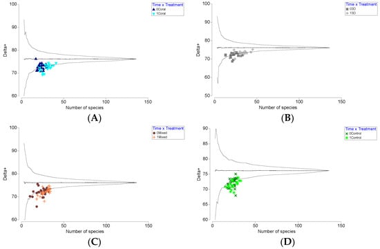 The ∆ is the average ‘taxonomic distance apart’ of every pair of individuals in a sample or the expected taxonomic path length between any two individuals chosen at random []. The ∆ is a natural extension of the Simpson diversity index where 0 = same species, 20 = different species in the same genus, 40 = different genera but same family, etc. The higher the ∆ value, the higher the taxonomic complexity is.