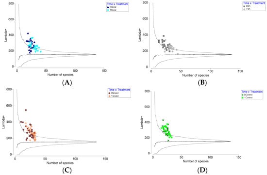 The Λ+ is the variance of the taxonomic distances between each pair of species i and j, about their mean distance ∆+ []. It has the potential to distinguish differences in taxonomic structure resulting, for example, in assemblages with some genera becoming highly species-rich while a range of other higher taxa are represented by only one (or very few) species. In that case, average TD may be unchanged but Λ+ will be greatly increased. Λ+ has a lack of dependence of its mean value on sampling effort.