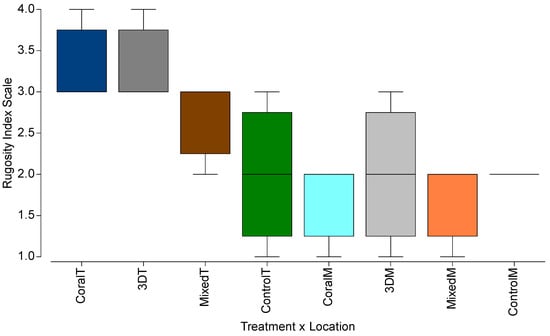 The structural complexity of surveyed reef substrates, which is known to have an important influence on fish community structure [], was evaluated following a six-point scale based on []: 0, no vertical relief; 1, low and sparse relief; 2, low but widespread relief; 3, moderately complex; 4, very complex with numerous caves and fissures, and 5, exceptionally complex with high coral cover and numerous caves and overhangs. Visual estimates were made on each replicate plot and averaged for each sampling site. Log10-transformed and normalized data were tested following a two-way PERMANOVA with treatment and location as main factors []. Multivariate correlation (RELATE) was used following 9999 permutations to correlate the calculated rugosity index with fish variables [].