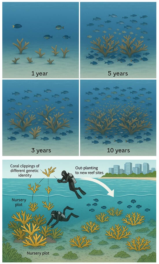 Global coral reef degradation requires innovative conservation and restoration approaches. Over the past three decades, numerous global restoration efforts have been implemented, ranging from community-based, small-scale projects [,] and various in situ coral nursery designs [,,], to the integrated use of artificial structures [,] and diverse coral gardening techniques []. These efforts also include state-of-the-art approaches such as novel land-based nurseries [], micro-fragmentation [,], larval rearing [], cryopreservation [,], and gene banking techniques [,,]. Additionally, coral restoration has incorporated novel methods like improved gardening techniques [], ecological engineering [,,], assisted migration [,], assisted evolution [], assisted microbiome [,], epigenetics [,], and chimerism []. The increasing threats from climate change and SLR on small island developing states (SIDS) necessitate a combination of emerging strategies to enhance resistance to extreme weather disturbances and rising sea levels, including the restoration of green/gray infrastructure, which will require strategies beyond coral restoration [].