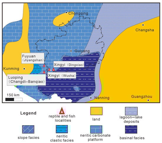 The late Ladinian (late Middle Triassic) Xingyi Fauna marks a key period in the major transition towards the “Modern-type” ecosystem. It is well defined by the appearance of large marine tetrapods and the earliest teleost fishes. The first marine reptile found in this fauna was the small pachypleurosaurid sauropterygian, Keichousaurus hui Young, 1958, from the Zhuganpo Member of the Falang Formation at Dingxiao Town, Xingyi City, Guizhou Province, in southwest China [] (Figure 1), and the first reported fishes were Habroichthys orientalis (Su, 1959), Asialepidotus shingyiensis Su, 1959, and Sinoeugnathus kueichowensis Su, 1959 []. Following their discoveries, abundant and complete skeletons of Keichousaurus and Asialepidotus were excavated by local farmers, but very few were collected and deposited in public institutes and museums, and there were almost no detailed studies of these taxa after their initial announcement and brief descriptions. Consequently, the diversity of the Xingyi Fauna was poorly understood; even the exact geographic and geological data concerning the fossil sites were not well constrained until the beginning of the 21st century []. Since 2001, besides Keichousaurus and Asialepidotus, more late Ladinian marine reptiles and fishes have been found, not only at Dingxiao of Xingyi, the original site of the Xingyi Fauna, but also in the broad region around Xingyi City, especially at Wusha Town in the western part of Xingyi City, Banqiao Town in east Luoping County, and Shibalianshan Town in east Fuyuan County of Yunnan Province (Figure 1). Although the geographic distribution of the Xingyi Fauna became better known, the stratigraphic distribution of individual taxa, the general diversity of the assemblage, and the absolute age of the fauna still remained poorly understood.