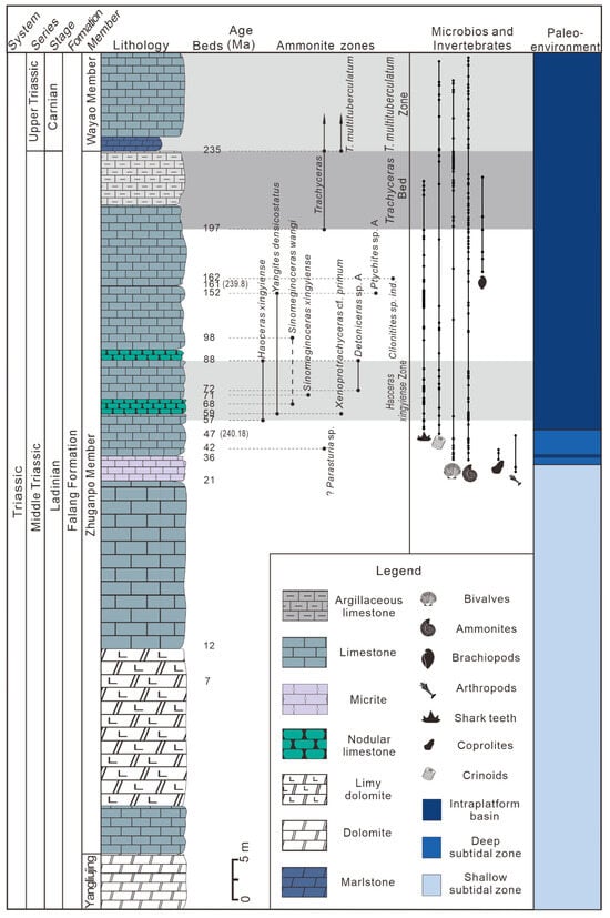 Xingyi City is located in southwestern Guizhou Province, about 320 km from the provincial capital Guiyang City. It was paleogeographically situated in the southwestern Upper Yangtze Platform (i.e., the Sichuan–Yunnan–Guizhou Carbonate Platform []), in an intraplatform basin close to the deep Nanpanjiang Basin (Figure 1). The sedimentary Triassic sequence comprises, in ascending order, the Middle Triassic Yangliujing Formation, the Zhuganpo Member and the Wayao Member of the Falang Formation, the Upper Triassic Laishike Formation, and the Jiangnan Formation. The fossiliferous level of the Xingyi Fauna lies in the middle Zhuganpo Member of the Falang Formation. The underlying Yangliujing Formation consists of dark grey thick-bedded dolomite, while the Zhuganpo Member of the Falang Formation consists of mainly grey to dark grey, thin to medium-bedded micritic limestones, nodular micritic limestones, argillaceous limestones, sandy limestones, marls, and shales. The overlying Wayao Member consists of medium to thick micritic limestones, marls, bioclastic limestones, and sandy limestones intercalated by yellow to dark grey calcareous clays and black shales [,,] (Figure 2).