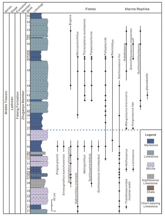 The fossiliferous beds of the Xingyi Fauna are completely exposed at Wusha Town of Xingyi, while at Dingxiao Town of Xingyi, Shibalianshan Town of Fuyuan, and Banqiao Town of Luoping, possibly only the lower part is exposed. Based on the new excavation and updated measurements, there are 33 fossiliferous beds with a combined thickness of 6.61 m at Wusha Town, within which two assemblages are recognized (Figure 2 and Figure 3). The Lower Assemblage ranges from sedimentary Bed 21 to 36 with a total thickness of about 2.92 m. These beds are lithologically muddy, laminated, and dark-colored limestones, characteristically rich in the small-sized pachypleurosaur Keichousaurus hui, Asialepidotus shingyiensis, peltopleurid fishes, a few bivalves, and the arthropod Schimperella acanthocercus, which is very common in the lowermost beds. The Upper Assemblage ranges from Bed 37 to 53 with a combined thickness of about 3.69 m. The lithology is dominated by limestones that are thicker than those in the Lower Assemblage beds, containing few skeletons of Keichousaurus hui but quite rich in the large ichthyosaur Guizhouichthyosaurus, the small to medium-sized ichthyosaur Qianichthyosaurus, the flying fish Thoracopterus wushaensis, crinoids, ammonoids, and bivalves [,] (Figure 3).