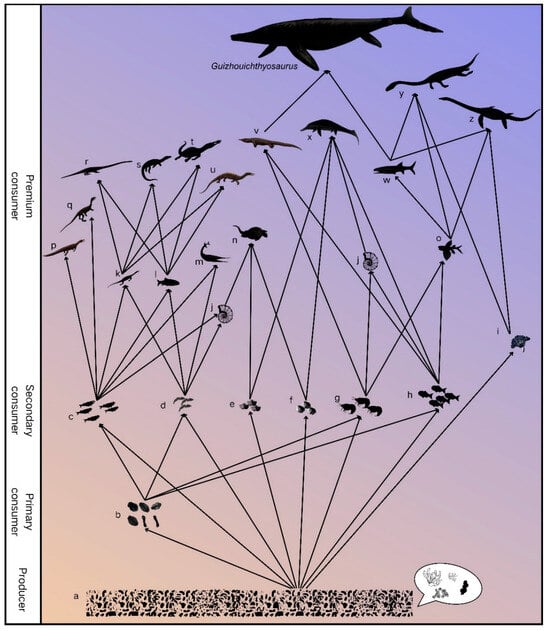A few large long-snouted ichthyosaur specimens from beds 42, 46, 50, and 53 in the Upper Assemblage of the Xingyi Fauna at Wusha Town were excavated, with estimated total lengths of 5–9 m or even larger in some adults (Figure 3 and Figure 4a). They probably represent a new species of Guizhouichthyosaurus (Shastasauridae, Ichthyosauria, Ichthyopterygia, Reptilia), but they are still under study. This taxon shows morphological similarities to the Late Triassic Guizhouichthyosaurus tangae and is phylogenetically close to the North American Late Triassic Shastasaurus. The body size of this species is the largest in the Ladinian Xingyi Fauna. Together with the cymbospondylids Thalattoarchon and Cymbospondylus from Nevada (USA) [,], it is one of the largest species in the Middle Triassic marine realm. Specimen XNGM-WS-50-R4, excavated from Bed 50, is 5 m in length and presents the oldest direct evidence for predation on megafauna. In its stomach, the trunk of a 4 m long thalattosaur, Xinpusaurus xingyiensis, was discovered. This is also the largest prey found inside any Mesozoic marine reptile [], which demonstrates that this large ichthyosaur species had become the top predator in the Middle Triassic marine ecosystem.