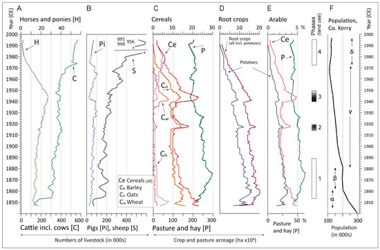 126. Chart, D.A. Two centuries of Irish agriculture. A statistical retrospect, 1672–1905. J. Stat. Soc. Inq. Soc. Irel. 1908, 12, 162–174. [Google Scholar]