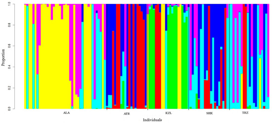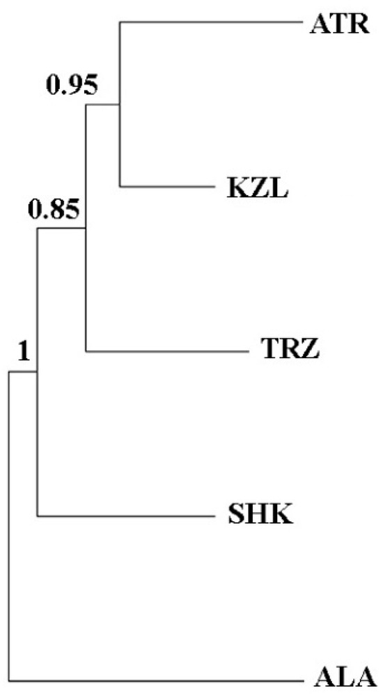 An analysis of five regional populations (ALA, ATR, KZL, SHK, and TRZ; n = 100 pooled samples) yielded 150 alleles (mean Na = 8.80 ± 0.42 per locus). The Shannon diversity index was highest in ALA (I = 1.879 ± 0.134) and lowest in SHK (I = 1.633 ± 0.096). VOLP67 (I = 2.468), followed by VOLP03, were the most informative markers across all populations. Observed heterozygosity (Ho) was highest in SHK (0.749 ± 0.047) and ATR (0.719 ± 0.033), and lowest in ALA (0.628 ± 0.065), despite its higher allelic richness. This indicates possible substructuring or inbreeding in ALA. Inbreeding coefficients were highest in ALA (F = 0.204), followed by KZL and TRZ, with minimal values in SHK (F = 0.001) and ATR (F = 0.050). Private allele frequencies varied, with ALA standing out (range: 0.013–0.788), while other populations had narrower ranges (~0.025–0.225), supporting both a shared ancestry and region-specific divergence.