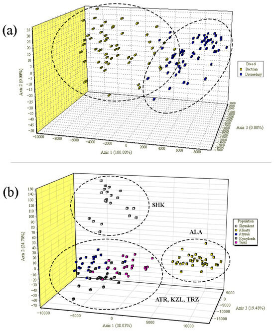 Finally, our findings align with an earlier ISSR-PCR analysis in Kazakhstan, which also revealed the genetic distinction of the SHK dromedary population and admixture in other groups [69]. These complementary results reinforce the need for expanded genomic studies, such as whole-genome re-sequencing, to further explore evolutionary history, adaptive loci, and trait-associated variation. Such insights will support evidence-based breeding programs and help conserve Kazakhstan’s unique camelid heritage.