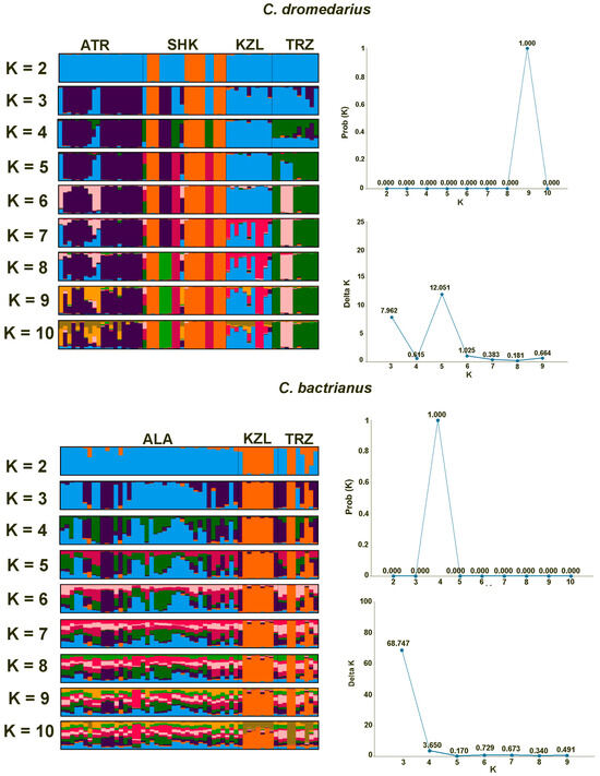 The best K results from the hierarchical STRUCTURE clustering. Variances of K = 2 to K = 10 are shown. Delta K values were calculated by the method of Evanno [39]; Prob (K) values were calculated by the method of Pritchard [38]. C. dromedarius, C. bactrianus.. Each population represented by the default color settings generated by the STRUCTURE software as follows: C. dromedarius—dark blue—ATR, orange—SHK, light blue—KZL, and green—TRZ, C. bactrianus—light blue—ALA, orange—KZL, dark blue—TRZ.
