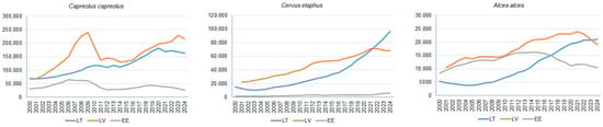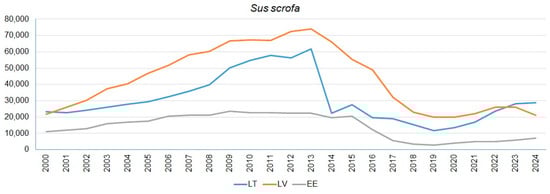 - Game Animal Census. Available online: https://am.lrv.lt/lt/veiklos-sritys-1/gamtos-apsauga/medziokle/ (accessed on 20 April 2025).