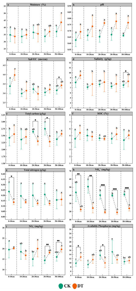 DT had no significant effect on overall soil moisture content (p > 0.05); however, in DT plots, moisture increased significantly with depth (p < 0.05), with the 50–100 cm layer exhibiting the highest value (Figure 2a). Although pH was not significantly altered (p > 0.05), a consistent upward trend with depth was observed under DT conditions (range 8.64–8.82) (Figure 2b). EC increased significantly in the 50–100 cm layer (p < 0.05), while no differences were noted at other depths. In both treatments, the surface layer (0–10 cm) showed higher EC than deeper layers, with this disparity becoming more pronounced after tillage (1.15–1.30 times) (Figure 2c). Salinity followed a similar vertical profile (Figure 2d). TC content was significantly reduced in the 20–50 cm range (p < 0.05), while surface (0–10 cm) and deep (50–100 cm) layers maintained significantly higher values than intermediate depths (p < 0.05, Figure 2e). SOC was unaffected overall but increased significantly at the surface layer post-treatment (p < 0.05, Figure 2f). TN content decreased by 44.68% in the surface layer under DT (p < 0.05), with no significant variation observed across other depths (p > 0.05, Figure 2g). NH4+-N concentrations declined across all layers, peaking at 10–20 cm, followed by 0–10 cm (Figure 2h). Conversely, NO3−-N increased significantly in the 30–50 cm and 50–100 cm layers (p < 0.05). While surface soils originally held 0.5–1.2 times more NO3−-N than deeper layers, this trend reversed under DT conditions (p < 0.05, Figure 2i). AP rose significantly in the 0–10 cm layer but declined in the 20–30 cm layer (p < 0.05). The AP peak shifted from 30–50 cm before tillage to the surface layer following treatment (Figure 2j).
