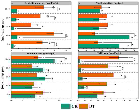 The effects of deep tillage on soil nitrogen transformation rates. Different lowercase letters indicate significant differences between different soil layers under the same treatment (p < 0.05); * and ** denote significant differences between the control and deep tillage treatments at the same soil depth (p < 0.05 and p < 0.01, respectively). (a) Denitrification rate; (b) nitrification rate; (c) anammox rate; (d) dissimilatory nitrate reduction to ammonium (DNRA) rate.