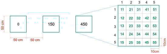 Experimental block design. Quadrat 0 represents a control plot without trampling, quadrate 150 was trampled by 150 passes (75 tourists) and quadrat 450 was trampled by 450 passes (225 tourists). The numbers 11, 21, 31, etc., correspond to the row and column numbers.