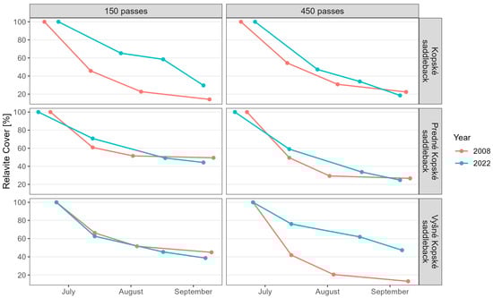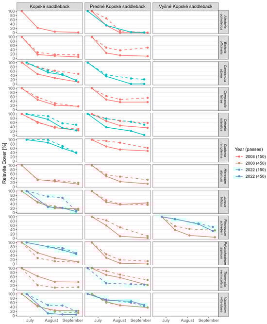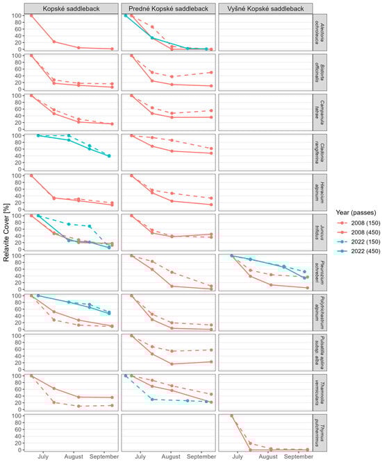 RC values in June, July, August, and September in 2008 and 2022 of selected species that disappeared in trampled areas as a delayed response to experimental trampling of vegetation. The values for relative cover, regression equations, R2, and the mean difference in relative cover per month are available in Supplementary Table S3a,b.