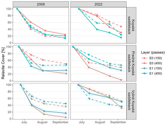 Relative cover of the E1 and E0 layers of the communities Juncetum trifidi (Kopske saddleback), Junco trifidi-Callunetum vulgaris (Predne Kopske saddleback), and Seslerietum tatrae (Vysne Kopske saddleback) in 2008 and 2022. The values for relative cover, regression equations, R2, and the mean difference in relative cover per month are available in Supplementary Table S2a,b.