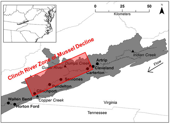 The Clinch River watershed of the upper Tennessee River basin of Virginia and Tennessee, USA, is an example of a watershed that has experienced both known and unknown causes of mussel declines in the past several decades [11]. This watershed supports one of North America’s greatest concentrations of freshwater biodiversity, with 46 extant mussel species, 20 of which are federally endangered, in addition to five federally threatened and endangered fish [12]. Significant declines in both diversity and abundance have been observed in mussel populations in certain reaches of the river. Notably, an 88 km reach of the river from downstream of the town of Carbo, Virginia (USA; river km 431) to Clinchport, Virginia (USA; river km 343) is considered a mussel zone of decline (ZOD; Figure 1; [11,13]). Within the ZOD, mussel densities decreased by more than 70% from 1979 to 2004 [12]. Both upstream and downstream of the ZOD, mussel populations remained stable or were increasing (i.e., numerous adult cohorts and evidence of recent recruitment; [12]) through 2014. Mass mortality events of the Pheasantshell Actinonaias pecterosa began occurring at some sites below the ZOD beginning in 2016, which were linked to pathogens [14,15]. Recent research on suspected mass mortality events from 2016 to 2020 has suggested that some of these events affected a wide range of species and increased in an upstream direction [15]. However, the relationship between mass mortality events and the ZOD remains uncertain.