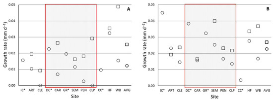 Average growth in mm d−1 for (A) juvenile Villosa iris deployed in the Clinch River system in 2012 and (B) juvenile Lampsilis fasciola deployed to the same sites in 2013. Open squares represent the growth rate in mussels deployed in cages, and circles represent those deployed in silos. The shaded area represents sites considered to be within the zone of decline. Tributaries to the Clinch River are marked with an asterisk: *.