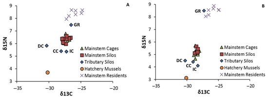 Resident mussels (Actinonaias pecterosa and V. iris) were collected at all sites where they occurred. Methods for resident mussel collection are found in Cope et al. [11]. For the present study, resident mussels were analyzed for stable isotopes in the same manner as the mussels deployed in cages and silos (Section 2.3). Resident mussels could only be sampled at mainstem sites due to availability.