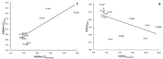 Significant relationships between natural log-transformed concentrations of trace elements in mussel (Villosa iris and Lampsilis fasciola) shells and concentrations in other matrices. (A) Fe in the soft tissues of the mussels (r2 = 0.340; p = 0.047), (B) Mn in the particulate fraction of sediment (r2 = 0.560; p = 0.008), (C) Mn + 1 in the dissolved fraction of overlying water (r2 = 0.675; p = 0.004), (D) Zn in the pore water (r2 = 0.345; p = 0.046). Sites are labeled, sites within the zone of decline are underlined, and tributaries are marked with an asterisk: *.