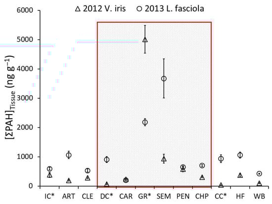 Spatial comparisons within the Clinch River System of mean (plus or minus standard error) mussel tissue concentrations of total PAH. Open triangles indicate Villosa iris deployed in 2012, and open circles indicate Lampsilis fasciola deployed in 2013. The shaded area represents sites considered to be within the zone of decline. Tributaries are marked with an asterisk: *.
