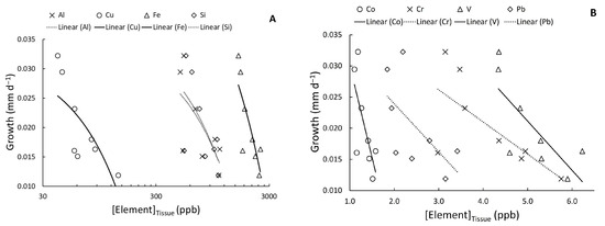 Linear relationships between mean soft tissue concentrations of trace elements in juvenile mussels and growth rates (mm d−1) of those mussels; (A) Al, Cu, Fe, and Si, and (B) Co, Cr, V, and Pb. Solid lines indicate significant (α = 0.05) relationships, while dotted lines indicate marginally significant (0.05 ≤ α ≤ 0.10) relationships.