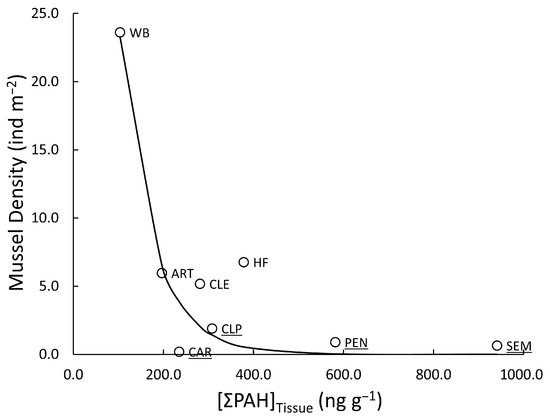 Density (individuals m−2) of co-occurring freshwater mussels as a function of the total PAH concentrations (ng g−1) accumulated in the tissue of juvenile mussels deployed to those sites in 2012. Sites in the zone of decline are underlined. The curvilinear relationship is described by y = a (1 − r)x (p = 0.024, r2 = 0.846).