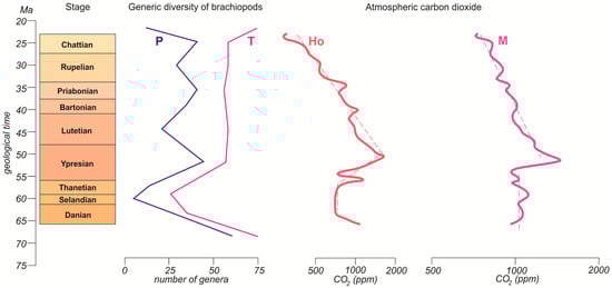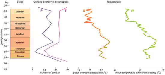 The two sources mentioned above [6,27] were used to document the Paleogene diversity dynamics of brachiopods with two curves. Curry and Brunton [6] explained the procedures of how they estimated diversity. The Paleobiology Database [27] offers automatic algorithm for the up-to-date diversity estimates. The resolution of the curves is limited to genera and stages. The curves were plotted along the present version of the geological time scale as established by the International Commission on Stratigraphy [31,32], if even needing some improvements [33]. The diversity curves are justified against the numerical time scale. The two curves refer to the differently compiled paleontological data, and, thus, they seem to be of equal importance, whereas differences between them should be understood as an indication of uncertainties of the present-day diversity estimates. These uncertainties can be related not only to possible data incompleteness, but also to taxonomic and stratigraphic deficiencies, which are inevitable in all kinds of paleontological compilations. This is why two curves should be considered simultaneously in the comparisons to the other information. It should be added that these curves (as well as the majority of other diversity curves constructed and interpreted in the contemporary paleobiological studies) cannot be understood as “final” reconstructions. Sampling biases, uncertainties in taxonomic interpretations, and possible stratigraphic errors always matter and cannot be avoided. This is why the interpretations presented in this analysis can be only provisional, and they will need updates in the future, i.e., together with the improvement of the paleontological knowledge.
