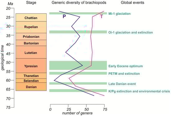 The abovementioned mass extinction was not the only major event in the considered geological time span (Figure 5). The other events were either short-term, such as the Late Danian warming [39,51,52], the Paleocene-Eocene thermal maximum (PETM) [39,41,53,54] and the associated extinction [55,56,57,58,59], and the Oi-1 glaciation [39,41,60,61,62] and the associated extinction at the Eocene–Oligocene transition [63,64,65,66,67], or relatively long-term events, such as the Early Eocene optimum [39,41,68]. From these events, the Early Eocene optimum coincided with the peak diversity of brachiopods, and PETM happened when the total number of genera actively increased (Figure 5). Apparently, these climatic changes established favorable conditions for the recovery of brachiopods after their Danian–Selandian decline. In contrast, the Late Danian warming did not interrupt the tendency towards a drop in diversity, but this was a relatively small-scale and short-term event in light of the present paleotemperature data [38,39]. As for the Oi-1 glaciation, it is known that this major event was preceded by a long-term cooling trend (Figure 3), and that the glaciation itself was, probably, less abrupt than imagined [69]; thus, brachiopods had enough time for gradual adaptation. The long-term tendency was not interrupted, although the moderate diversity decrease in the Rupelian [27] can be related to the effects of the Oi-1 glaciation and associated biotic perturbations.