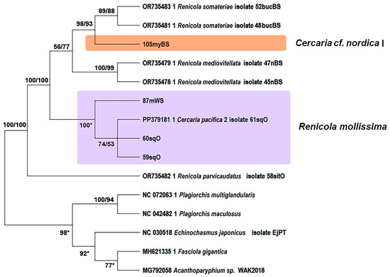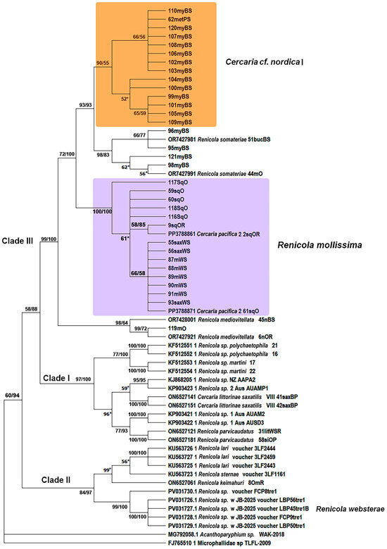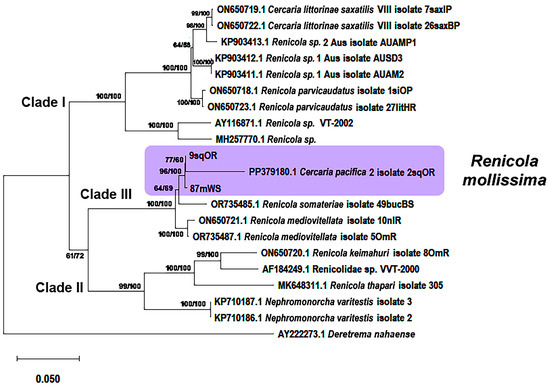 Despite repeated attempts to develop the classification of the family Renicolidae, it remains confusing [1,2]. Only two genera are currently recognised as valid: Renicola Cohn, 1904 and Nephromonorcha Leonov, 1958. Their adults differ in the number of testes: two separate testes in the former and one testis (resulting from merging of two) in the latter genus [1,3]. Progress in our understanding of the classification and evolution of renicolids has been achieved owing to the integrative taxonomy, which combines molecular methods with traditional morphological ones [4,5]. Three clades are clearly distinguished in the phylograms of the Renicolidae based on nuclear and mitochondrial DNA sequences of the species studied to date [6,7,8]. Clade I (‘Parvicaudata’ group) contains species with styleted cercariae with a simple tail (Xiphidiocercaria group) using coastal caenogastropods as FIHs. Their SIHs are molluscs (presumably bivalves) and, less often, polychaetes, while DHs are gulls and, probably, waders. Clade II consists of species with large non-styleted cercariae with tail fins (Rhodometopa group) or non-styleted larvae of the transitional morphotype from typical xiphidiocercariae to cercariae of Rhodometopa group. Their FIHs are sublittoral caenogastropods, SIHs are fishes, and DHs are various groups of seabirds such as auks, gulls, petrels, shags, penguins, etc.