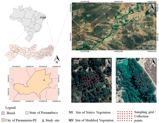 The study was carried out in two distinct areas in the Brígida River Watershed located in the municipality of Parnamirim in the upper Sertão region of the state of Pernambuco, Brazil. These areas are classified as native vegetation (NV) and modified vegetation (MV) and are represented in Figure 1. The climate of the region is classified as BSwh according to Köppen’s classification, characterized as semi-arid tropical, with an average annual temperature around 26 °C, average annual rainfall of approximately 569 mm, and potential evapotranspiration of about 1600 mm. The relief is flat, with slight elevations and a predominance of crystalline geology.