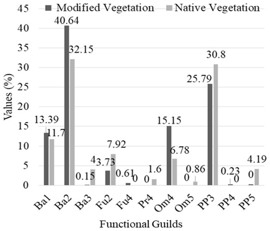 Soil variables, such as moisture, sand, electrical conductivity, organic matter, and silt, exerted influence on most guilds in the native vegetation area, while clay, pH, and fine sand influenced only the guilds Fu4 and PP4 in the modified vegetation area.