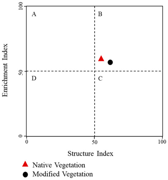 Food web analysis of nematode communities in modified and native vegetation areas, based on the quadrants delimited by the enrichment (EI) and structure indices (SI). The letters A, B, C, and D refer to the quadrants of the percentages.