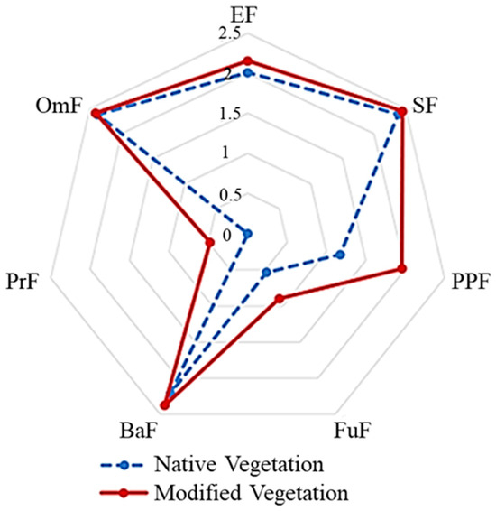 Radial plot for the values of metabolic activity indices in modified and native vegetation areas (values normalized by log(x+1) transformation). CF, SF, EF, PPF, BaF, FuF, PrF, and OmF represent the composite footprint, structure, enrichment, plant-parasitic nematodes’, bacterivores’, fungivores’, predators’, and omnivores’ metabolic footprints, respectively.