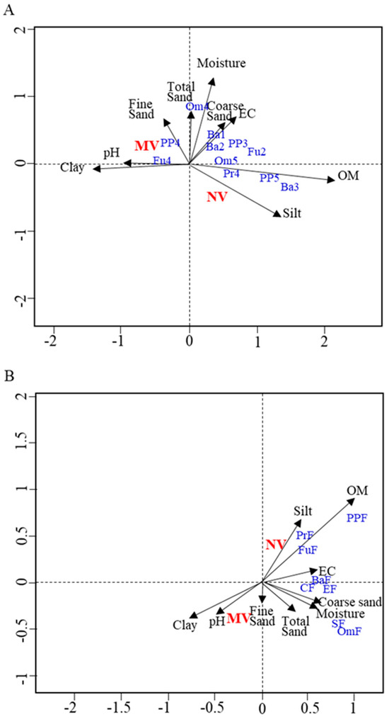 Redundancy analysis (RDA) based on the relationship between nematode guilds and environmental variables (A) and based on the relationship between metabolic activity indices and environmental variables (B). MV: modified vegetation; NV: native vegetation. Environmental variables: EC: electrical conductivity of the soil saturation extract; OM: soil organic matter. CF, SF, EF, PPF, BaF, FuF, PrF, and OmF represent the composite metabolic footprint, structure, enrichment, plant-parasitic nematodes’, bacterivores’, fungi, predators’, and omnivores’ metabolic footprints, respectively.