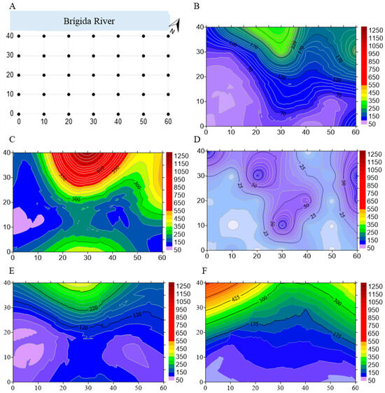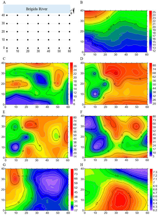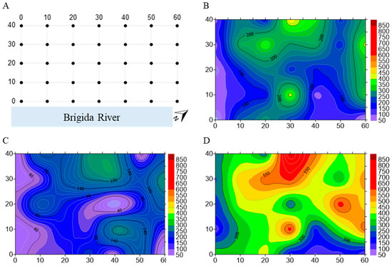 Data collection was carried out at 35 points marked on the ground downstream of the Fomento and Alexandria dams, forming a 60 × 40 m regular grid, with 10 m spacing between points. In total, 70 disturbed soil samples were collected. Each one was in the 0.0–0.3 m layer. After collection, the materials were properly stored and sent for physical, chemical, and biological analyses.