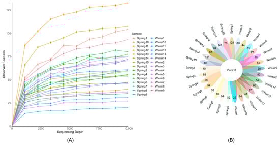 The rarefaction curve illustrates the variation in the number of observed species in each sample as sequencing depth (sequence count) increases. By randomly sampling sequences and calculating the number of species, the rarefaction curve reflects the accumulation of species and is used to evaluate whether the sequencing depth is sufficient to capture most of the species in the sample. The results indicate that as sequencing depth increases, the number of observed species gradually rises and eventually plateaus, suggesting that the current sequencing depth has captured the majority of species in the samples (Figure 1A). A total of approximately 4,105,267 raw reads were obtained from 29 samples. After merging, filtering, and chimera removal, 2,973,971 valid sequences were obtained (Supplementary Table S2). After denoising and filtering out low-abundance OTUs (Operational Taxonomic Units), 1,137 OTUs were identified, with Winter1 containing the fewest OTUs (25) and Spring11 containing the most OTUs (142) (Figure 1B).