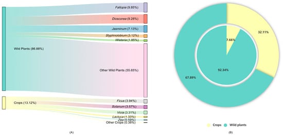 (A) Proportional composition of wild plant versus crop food items in the macaque diet (pooled data from spring and winter); (B) Seasonal shift in dietary resource allocation between wild plants and crops, with inner ring representing spring and outer ring indicating winter.